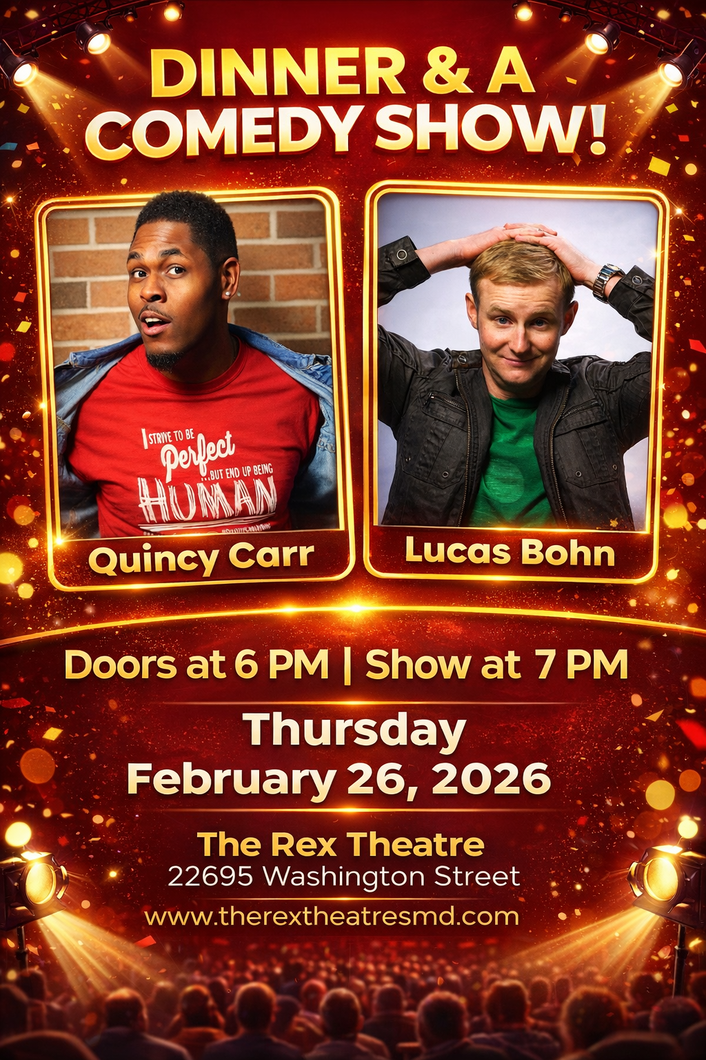 We are excited to announce two headlining comedians at our theatre! Come have a laugh, some dinner, and drinks!